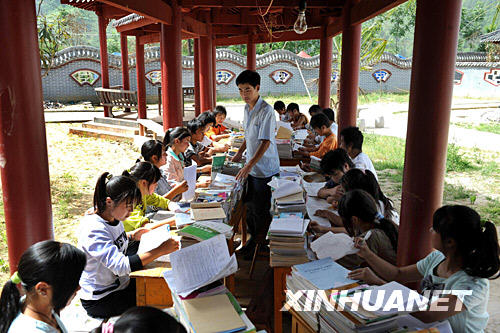 四川汶川大地震发生以来,陕西灾情严重的汉中市宁强县青木川镇一直余震不断,从5月19日开始,该校初三年级学生在校园较安全的走廊里坚持上课,备战中考。 新华社记者 陶明 摄