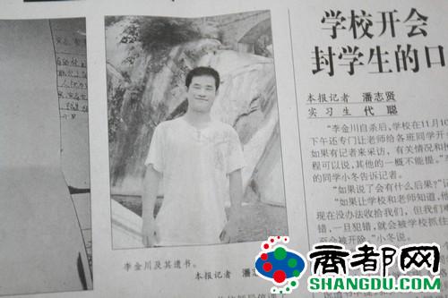 主持人:校方认为责任不在自己,而李金川的父亲认为孩子的死跟学校有责任,事情的转机就在一份《说明》上,这个《说明》上明确指出在李金川的死亡很大原因是由于李金川本身性格比较孤僻、内向,很少与人交流,但是这份说明中完全没有说出李金川遗书中反应的学校的不正之风,我特别不明白李金川的自杀仅仅是因为像这份说明中所说的一样,只是因为他抑郁、厌世这么简单呢?昨天《中国青年报》也做了一个整版的特别报道,我想潘老师对这件事情是最清楚的,您觉得呢?