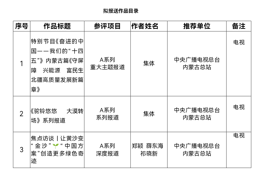 按照内蒙古自治区新闻工作者协会《关于开展第34届内蒙古新闻奖评选暨第36届中国新闻奖作品初评的通知》要求,中央广播电视总台内蒙古总站举办了推荐作品初评会,3件作品通过初评,特此公示。