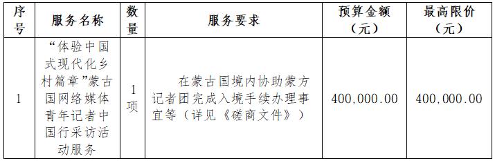北京明世继元招标有限公司受内蒙古日报社委托对其‘“体验中国式现代化乡村篇章”蒙古国网络媒体青年记者中国行采访活动服务’项目组织竞争性磋商采购活动,欢迎潜在的供应商到北京明世继元招标有限公司获取竞争性磋商文件(以下简称“磋商文件”),并于